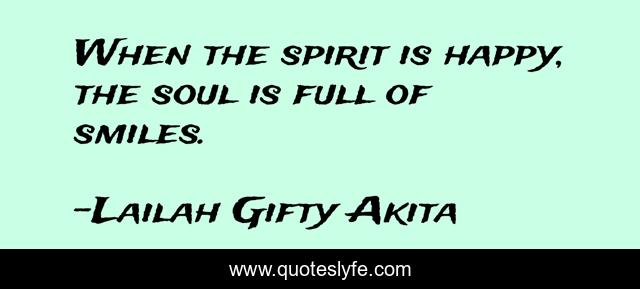 This page presents the quote "When the spirit is happy, the soul is full of smiles.". Author of this quote is Lailah Gifty Akita. This quote is about joy, philosophy, soul, well-being, life-lessons, spirit, happiness,.