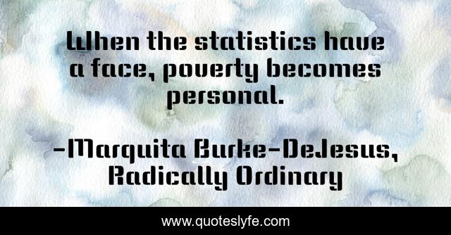 This page presents the quote "When the statistics have a face, poverty becomes personal.". Author of this quote is Marquita Burke-DeJesus, Radically Ordinary. This quote is about love, poverty, affection,.