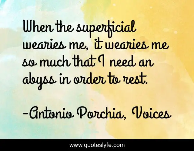 This page presents the quote "When the superficial wearies me, it wearies me so much that I need an abyss in order to rest.". Author of this quote is Antonio Porchia, Voices. This quote is about superficiality, solitude,.