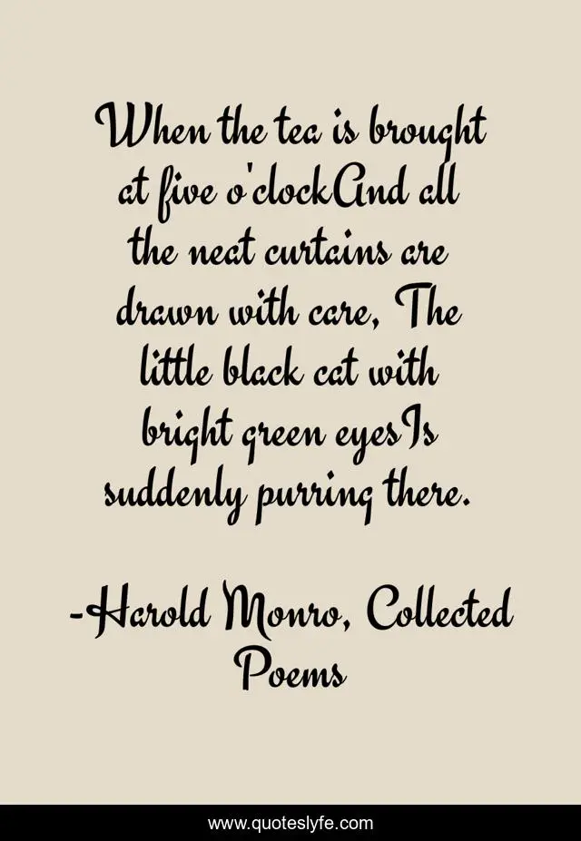 This page presents the quote "When the tea is brought at five o'clockAnd all the neat curtains are drawn with care, The little black cat with bright green eyesIs suddenly purring there.". Author of this quote is Harold Monro, Collected Poems. This quote is about tea, cats,.