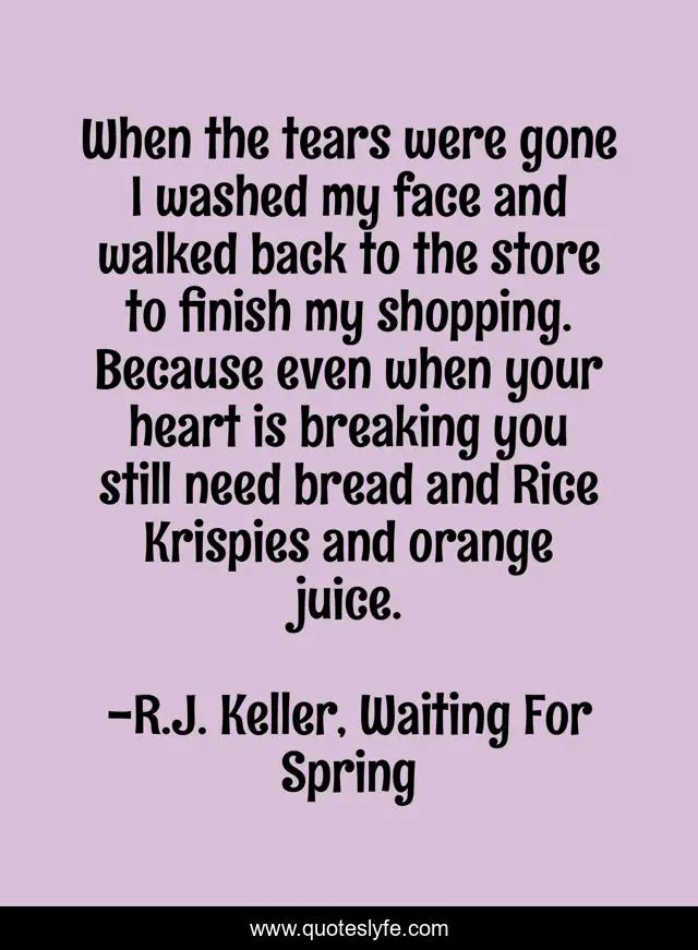 This page presents the quote "When the tears were gone I washed my face and walked back to the store to finish my shopping. Because even when your heart is breaking you still need bread and Rice Krispies and orange juice.". Author of this quote is R.J. Keller, Waiting For Spring. This quote is about break-ups, survival,.