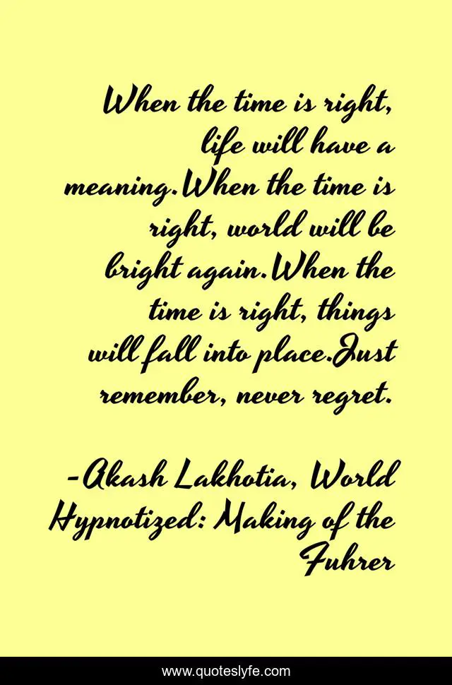 This page presents the quote "When the time is right, life will have a meaning.When the time is right, world will be bright again.When the time is right, things will fall into place.Just remember, never regret.". Author of this quote is Akash Lakhotia, World Hypnotized: Making of the Fuhrer. This quote is about past, regret, right-time, thought, thought-on-life, time, regrets, thoughts,.