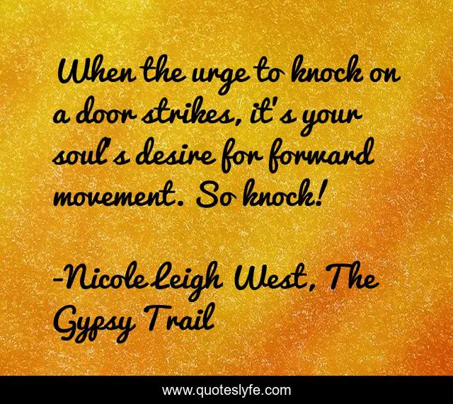 This page presents the quote "When the urge to knock on a door strikes, it's your soul's desire for forward movement. So knock!". Author of this quote is Nicole Leigh West, The Gypsy Trail. This quote is about freedom, inspiration, spiritual-growth,.