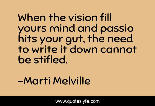 This page presents the quote "When the vision fill yours mind and passio hits your gut, the need to write it down cannot be stifled.". Author of this quote is Marti Melville. This quote is about author, creativity, writers, passion, authors, marti-melville, writers-on-writing, vision,.