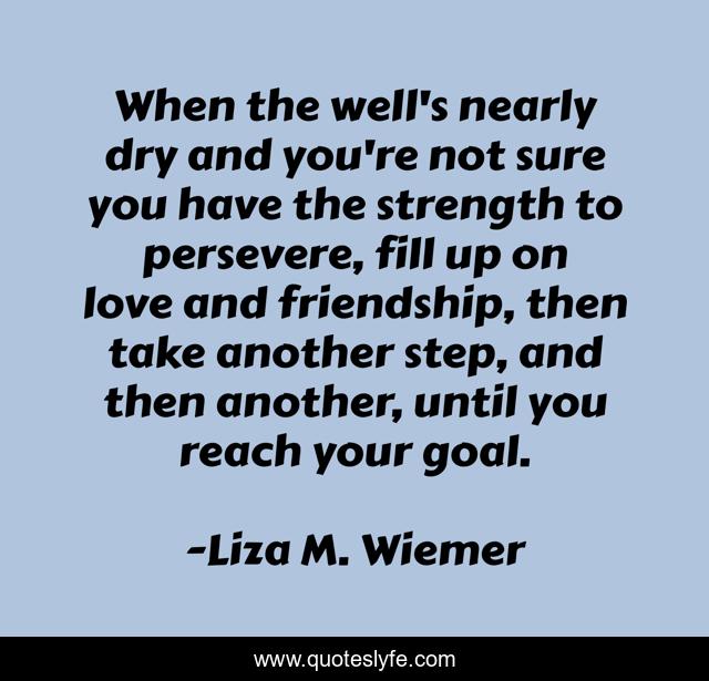 This page presents the quote "When the well's nearly dry and you're not sure you have the strength to persevere, fill up on love and friendship, then take another step, and then another, until you reach your goal.". Author of this quote is Liza M. Wiemer. This quote is about persevere, perseverance, love, goal, goal-setting, friends, endurance, don-t-give-up, liza-wiemer,.
