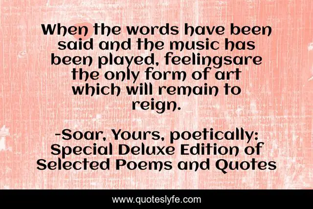 This page presents the quote "When the words have been said and the music has been played, feelingsare the only form of art which will remain to reign.". Author of this quote is Soar, Yours, poetically: Special Deluxe Edition of Selected Poems and Quotes. This quote is about love, loyalty, poetry, feelings, affection, care,.