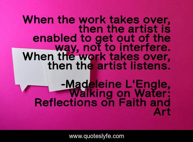 This page presents the quote "When the work takes over, then the artist is enabled to get out of the way, not to interfere. When the work takes over, then the artist listens.". Author of this quote is Madeleine L'Engle, Walking on Water: Reflections on Faith and Art. This quote is about work, art, listening,.