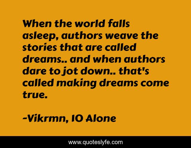 This page presents the quote "When the world falls asleep, authors weave the stories that are called dreams.. and when authors dare to jot down.. that's called making dreams come true.". Author of this quote is Vikrmn, 10 Alone. This quote is about 10-alone, author, ten-alone, quotes-on-authors, ca-vikram-verma, vikrmn, sleep, vikram-verma, dreams,.