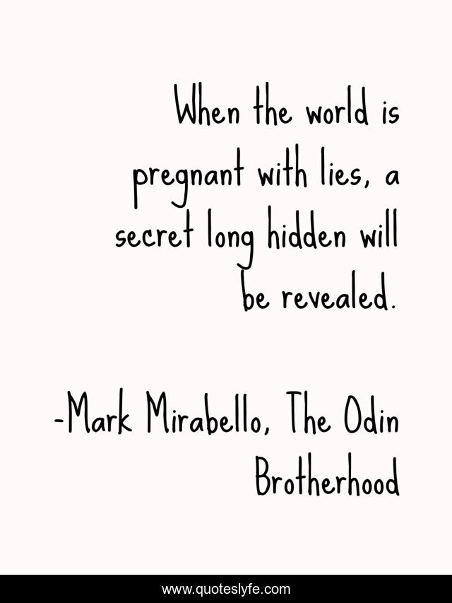 This page presents the quote "When the world is pregnant with lies, a secret long hidden will be revealed.". Author of this quote is Mark Mirabello, The Odin Brotherhood. This quote is about lies, secret, revelation,.