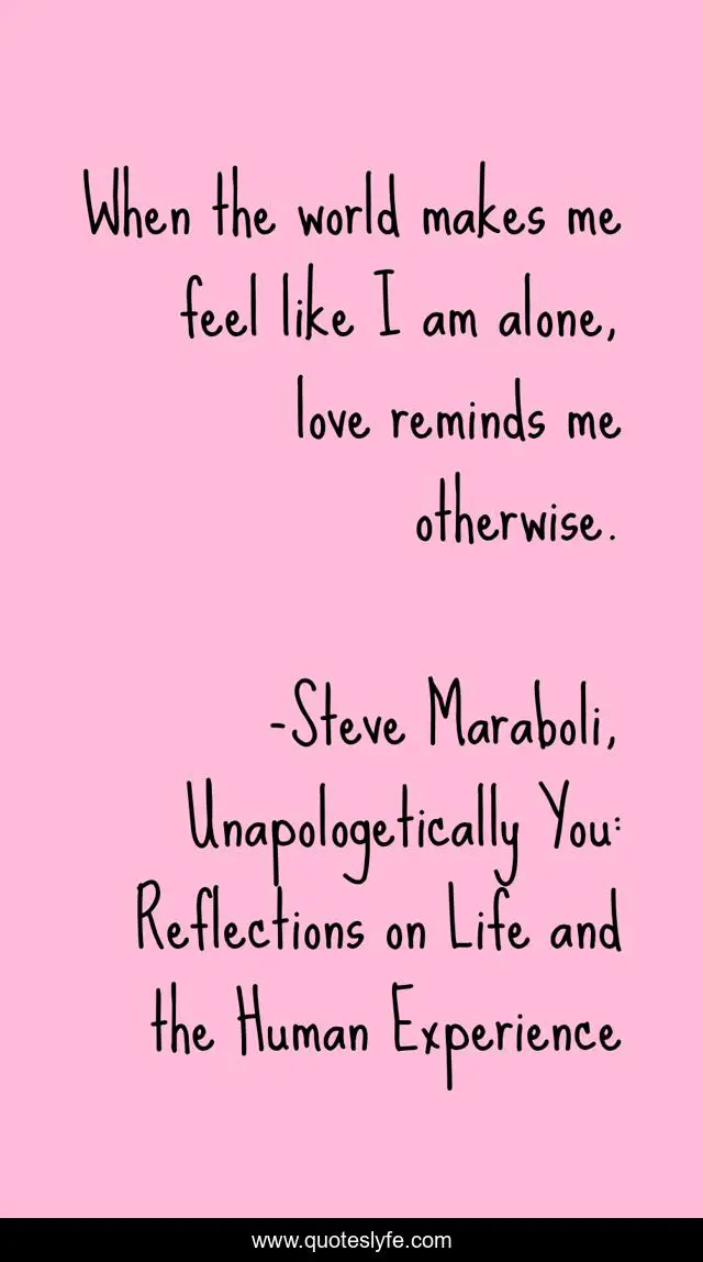 This page presents the quote "When the world makes me feel like I am alone, love reminds me otherwise.". Author of this quote is Steve Maraboli, Unapologetically You: Reflections on Life and the Human Experience. This quote is about life, love, happiness, alone, world, affection,.