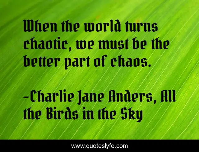 This page presents the quote "When the world turns chaotic, we must be the better part of chaos.". Author of this quote is Charlie Jane Anders, All the Birds in the Sky. This quote is about world, life, chaos,.