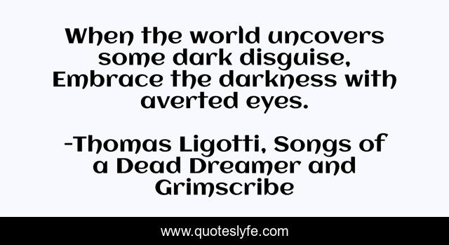 This page presents the quote "When the world uncovers some dark disguise, Embrace the darkness with averted eyes.". Author of this quote is Thomas Ligotti, Songs of a Dead Dreamer and Grimscribe. This quote is about horror, verse, fiction,.