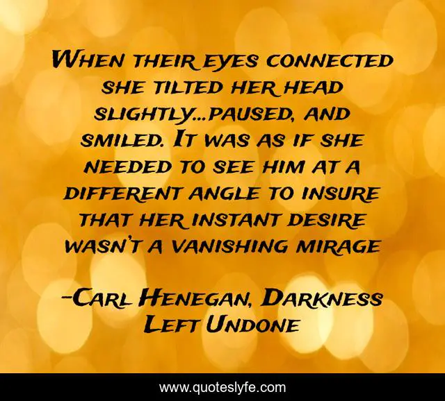 This page presents the quote "When their eyes connected she tilted her head slightly…paused, and smiled. It was as if she needed to see him at a different angle to insure that her instant desire wasn’t a vanishing mirage". Author of this quote is Carl Henegan, Darkness Left Undone. This quote is about desire, eyes, love, first-sight, mirage, affection,.