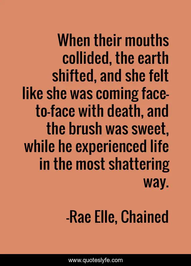 This page presents the quote "When their mouths collided, the earth shifted, and she felt like she was coming face-to-face with death, and the brush was sweet, while he experienced life in the most shattering way.". Author of this quote is Rae Elle, Chained. This quote is about life, death, love, chained, sweet, paranormal, vampire, romance, kiss,.