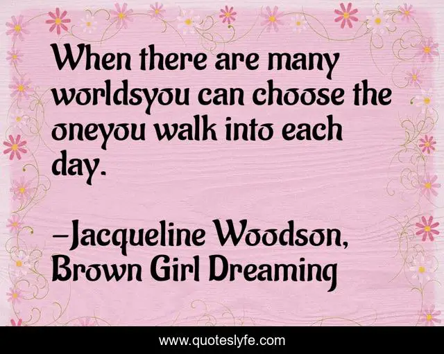 This page presents the quote "When there are many worldsyou can choose the oneyou walk into each day.". Author of this quote is Jacqueline Woodson, Brown Girl Dreaming. This quote is about enthusiasm, inspirational,.