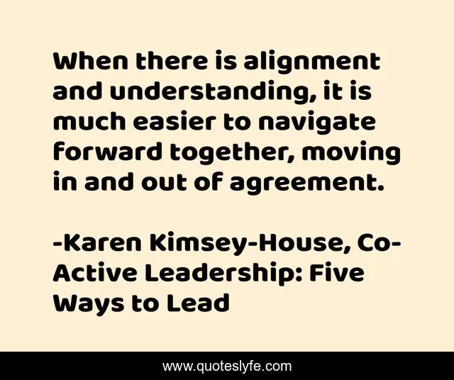 This page presents the quote "When there is alignment and understanding, it is much easier to navigate forward together, moving in and out of agreement.". Author of this quote is Karen Kimsey-House, Co-Active Leadership: Five Ways to Lead. This quote is about leadership-development, agreement, understanding, agreement-with-reality, navigation, alignment,.