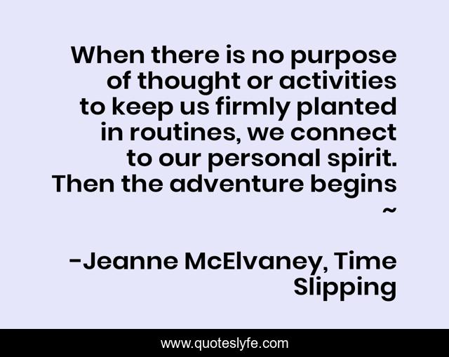This page presents the quote "When there is no purpose of thought or activities to keep us firmly planted in routines, we connect to our personal spirit. Then the adventure begins ~". Author of this quote is Jeanne McElvaney, Time Slipping. This quote is about being-happy, self-awareness, old-maggie-s-spirit-whispers, change-your-life, life-purpose, gotospirit-com, jeanne-mcelvaney, self-improvement, personal-development,.