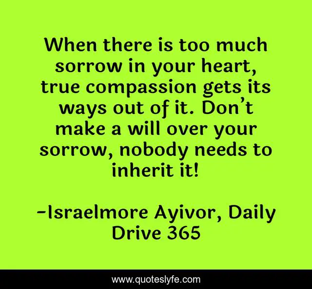This page presents the quote "When there is too much sorrow in your heart, true compassion gets its ways out of it. Don’t make a will over your sorrow, nobody needs to inherit it!". Author of this quote is Israelmore Ayivor, Daily Drive 365. This quote is about heart, food-for-thought, rejoice, a-will, joy, sorrow, compassionate, be-happy, compassion,.