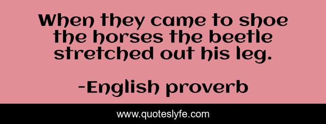 This page presents the quote "When they came to shoe the horses the beetle stretched out his leg.". Author of this quote is English proverb. This quote is about character, personality,.