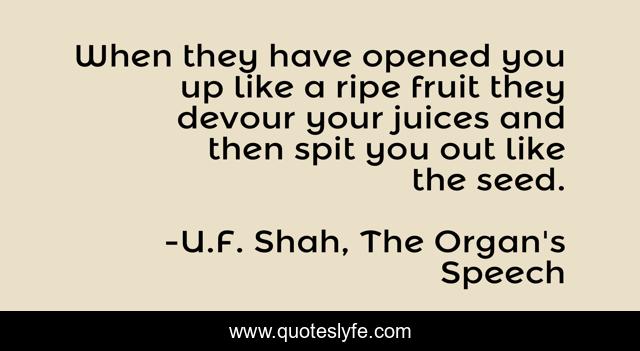 This page presents the quote "When they have opened you up like a ripe fruit they devour your juices and then spit you out like the seed.". Author of this quote is U.F. Shah, The Organ's Speech. This quote is about life, life-lessons,.