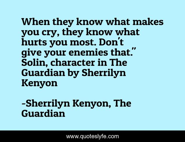 This page presents the quote "When they know what makes you cry, they know what hurts you most. Don't give your enemies that." Solin, character in The Guardian by Sherrilyn Kenyon". Author of this quote is Sherrilyn Kenyon, The Guardian. This quote is about harm, cry, character, protect, hurt, enemies,.