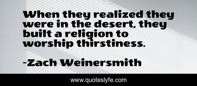 This page presents the quote "When they realized they were in the desert, they built a religion to worship thirstiness.". Author of this quote is Zach Weinersmith. This quote is about philosophy, theology,.