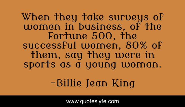 This page presents the quote "When they take surveys of women in business, of the Fortune 500, the successful women, 80% of them, say they were in sports as a young woman.". Author of this quote is Billie Jean King. This quote is about sports, woman, women,.
