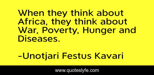 This page presents the quote "When they think about Africa, they think about War, Poverty, Hunger and Diseases.". Author of this quote is Unotjari Festus Kavari. This quote is about enthusiasm, poverty, war, inspirational,.