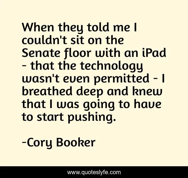 This page presents the quote "When they told me I couldn't sit on the Senate floor with an iPad - that the technology wasn't even permitted - I breathed deep and knew that I was going to have to start pushing.". Author of this quote is Cory Booker. This quote is about me, start, deep,.