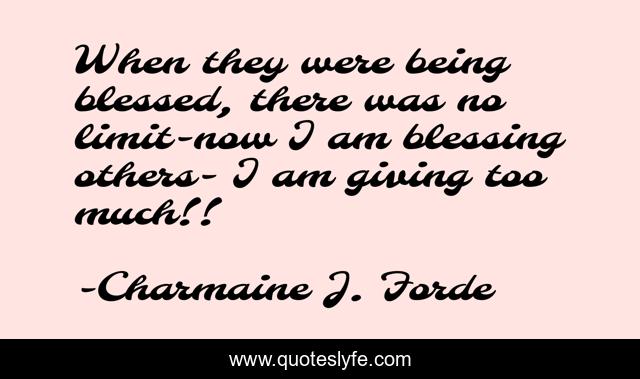 This page presents the quote "When they were being blessed, there was no limit-now I am blessing others- I am giving too much!!". Author of this quote is Charmaine J. Forde. This quote is about giving, blessing, blessed, no-limit,.
