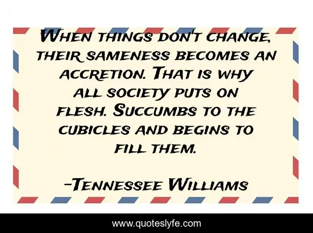 This page presents the quote "When things don't change, their sameness becomes an accretion. That is why all society puts on flesh. Succumbs to the cubicles and begins to fill them.". Author of this quote is Tennessee Williams. This quote is about monotony, change,.