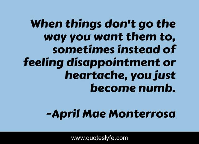 This page presents the quote "When things don't go the way you want them to, sometimes instead of feeling disappointment or heartache, you just become numb.". Author of this quote is April Mae Monterrosa. This quote is about heartache, numbness, things-going-wrong, unwanted, disappointment, love-love,.