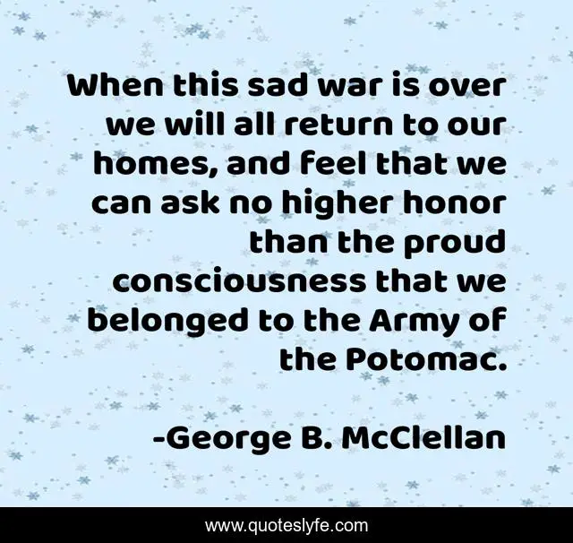 This page presents the quote "When this sad war is over we will all return to our homes, and feel that we can ask no higher honor than the proud consciousness that we belonged to the Army of the Potomac.". Author of this quote is George B. McClellan. This quote is about proud, honor, sad,.