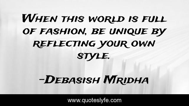 This page presents the quote "When this world is full of fashion, be unique by reflecting your own style.". Author of this quote is Debasish Mridha. This quote is about fashion, debasish-mridha, philosophy, have-style, world-full-of-fashion, quotes, debasish-mridha-md, inspirational, be-unique,.