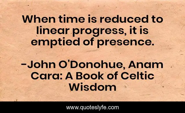 This page presents the quote "When time is reduced to linear progress, it is emptied of presence.". Author of this quote is John O'Donohue, Anam Cara: A Book of Celtic Wisdom. .