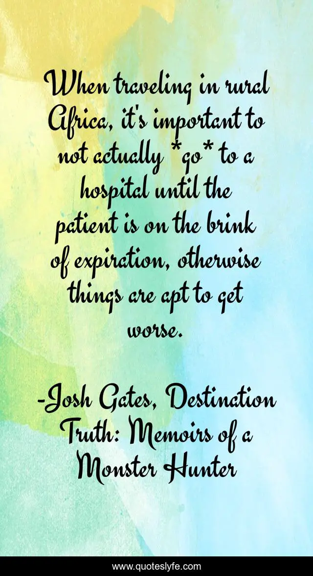 This page presents the quote "When traveling in rural Africa, it's important to not actually *go* to a hospital until the patient is on the brink of expiration, otherwise things are apt to get worse.". Author of this quote is Josh Gates, Destination Truth: Memoirs of a Monster Hunter. This quote is about hospital, death, africa, traveling,.