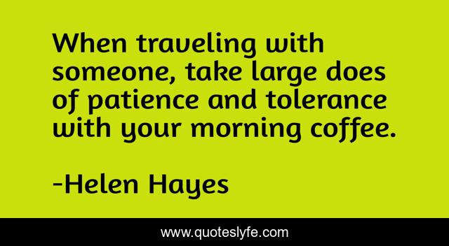 This page presents the quote "When traveling with someone, take large does of patience and tolerance with your morning coffee.". Author of this quote is Helen Hayes. This quote is about travel, coffee, morning,.