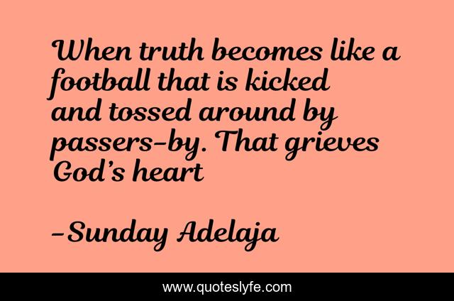 This page presents the quote "When truth becomes like a football that is kicked and tossed around by passers-by. That grieves God’s heart". Author of this quote is Sunday Adelaja. This quote is about heart, kicked, around, becomes, grieves, football, truth, god, passers-by,.