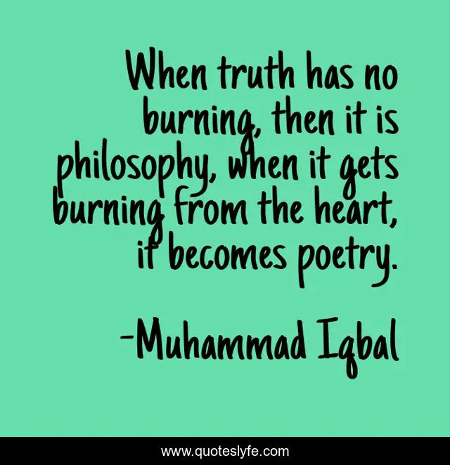 This page presents the quote "When truth has no burning, then it is philosophy, when it gets burning from the heart, it becomes poetry.". Author of this quote is Muhammad Iqbal. This quote is about heart, philosophy, poetry,.