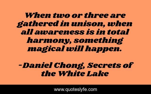 This page presents the quote "When two or three are gathered in unison, when all awareness is in total harmony, something magical will happen.". Author of this quote is Daniel Chong, Secrets of the White Lake. This quote is about enthusiasm, inspirational,.