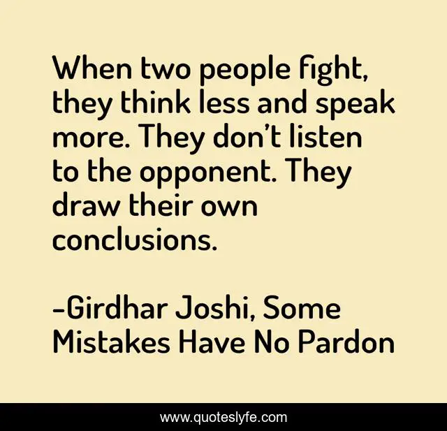This page presents the quote "When two people fight, they think less and speak more. They don’t listen to the opponent. They draw their own conclusions.". Author of this quote is Girdhar Joshi, Some Mistakes Have No Pardon. This quote is about conclusions, fight, opponent,.