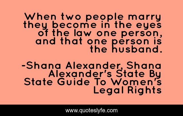 This page presents the quote "When two people marry they become in the eyes of the law one person, and that one person is the husband.". Author of this quote is Shana Alexander, Shana Alexander's State By State Guide To Women's Legal Rights. This quote is about coverture, feminism, patriarchy,.