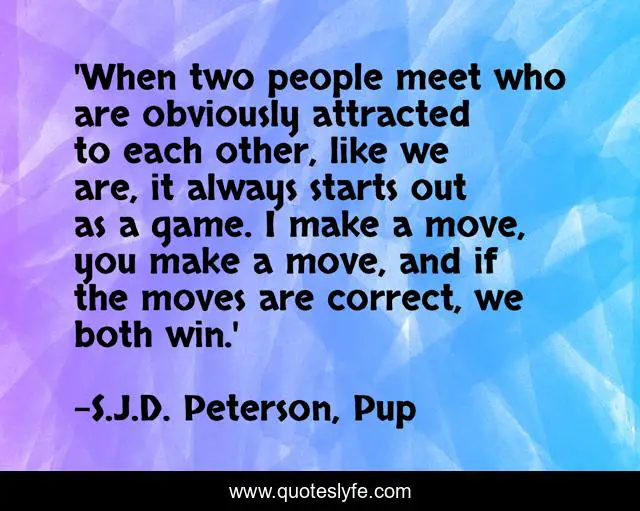 This page presents the quote "'When two people meet who are obviously attracted to each other, like we are, it always starts out as a game. I make a move, you make a move, and if the moves are correct, we both win.'". Author of this quote is S.J.D. Peterson, Pup. This quote is about attraction, smooth-talker,.