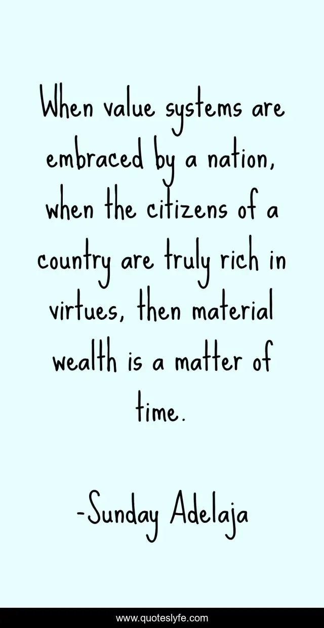 This page presents the quote "When value systems are embraced by a nation, when the citizens of a country are truly rich in virtues, then material wealth is a matter of time.". Author of this quote is Sunday Adelaja. This quote is about virtues, value, matter, embraced, rich, time, systems,.