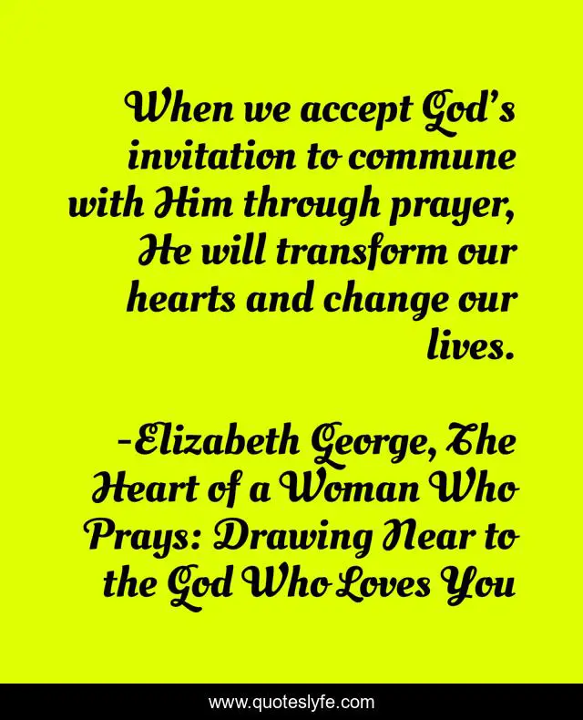 This page presents the quote "When we accept God’s invitation to commune with Him through prayer, He will transform our hearts and change our lives.". Author of this quote is Elizabeth George, The Heart of a Woman Who Prays: Drawing Near to the God Who Loves You. This quote is about heart, christian-women, god, elizabeth-george, transform, christianity, prayer, change,.