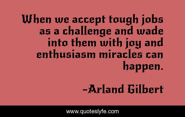 This page presents the quote "When we accept tough jobs as a challenge and wade into them with joy and enthusiasm miracles can happen.". Author of this quote is Arland Gilbert. .