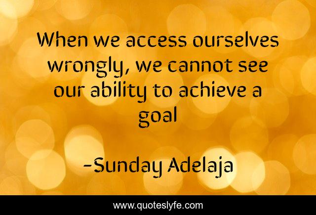 This page presents the quote "When we access ourselves wrongly, we cannot see our ability to achieve a goal". Author of this quote is Sunday Adelaja. This quote is about life, goal, mission, calling, purpose, achieve, ability,.