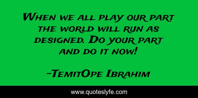 This page presents the quote "When we all play our part the world will run as designed. Do your part and do it now!". Author of this quote is TemitOpe Ibrahim. This quote is about confidence, diversity, complete, roles, god, motivational, everyone-is-important, role-play, inspirational,.