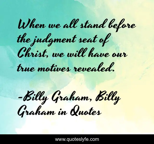 This page presents the quote "When we all stand before the judgment seat of Christ, we will have our true motives revealed.". Author of this quote is Billy Graham, Billy Graham in Quotes. This quote is about judgment, billy-graham,.