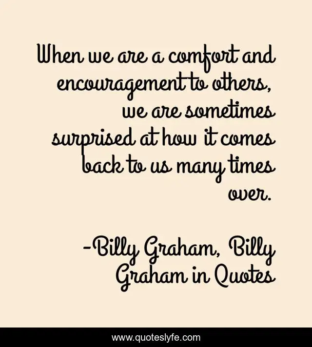 This page presents the quote "When we are a comfort and encouragement to others, we are sometimes surprised at how it comes back to us many times over.". Author of this quote is Billy Graham, Billy Graham in Quotes. This quote is about comfort, billy-graham,.